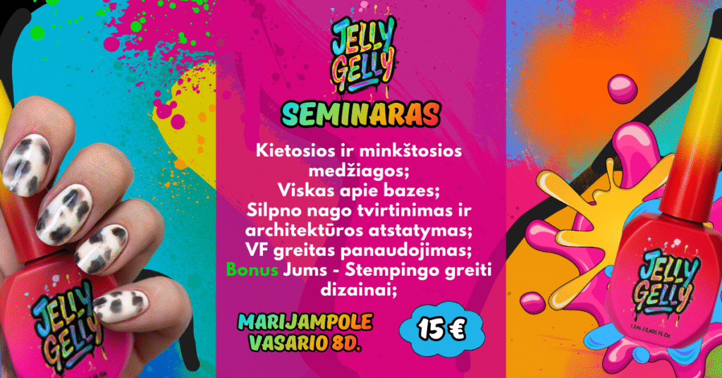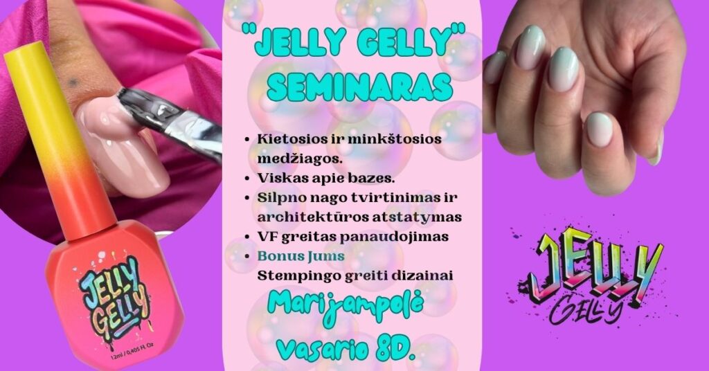 „Jelly Gelly“ seminaras Marijampolėje Kviečiame nagų meistres į gyvą „Jelly Gelly“ seminarą Marijampolėje, kuriame derinama teorinė ir praktinė dalys. Seminaras skirtas toms, kurios nori geriau suprasti nagų medžiagas, bazes, architektūrą ir atrasti efektyvius sprendimus kasdieniniame meistro darbe. Mokymų metu ne tik bus pateikiama aiški, struktūruota informacija, bet ir gyvai demonstruojamos technikos ant modelio, kad žinias būtų galima iš karto pritaikyti praktikoje.